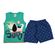 Camiseta manga curta verde água, com gola e abertura com 2 casas e 2 botões, totalmente estampada na frente, bermuda azul marinho em moletinho com bolsos redondos e braguilha como detalhe.