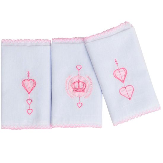 Babete Bordada Feminina Coroa Branco e Rosa Kit com 3 Unidades