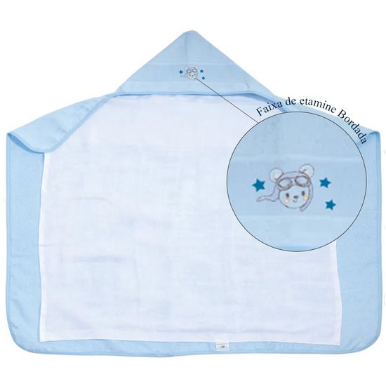 Toalha com Capuz e Forro de Fralda Masculina Bordada Ursinho Aviador